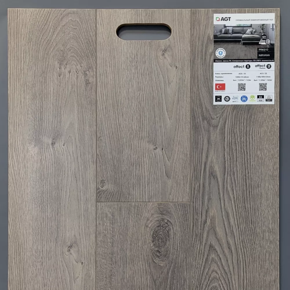 Ламинированное напольное покрытие AGT Effect Elegance 12-33 PRK 910 Нирвана 4V фаска, структура натурального дерева, влагостойкая панель ХДФ (древесноволокнистая плита высокой плотности), блеск поверхности - матовый. Можно приобрести на сайте в Москве дешево. Этот влагостойкий продукт 33 класса стойкости прекрасно будет смотреться в любом дизайне дома или офиса с минимальной нагрузкой на поверхность. Оплата: наличный и безналичный расчёт, возможна покупка в кредит. Доставка: Москва, Санкт-Петербург, другие города России.